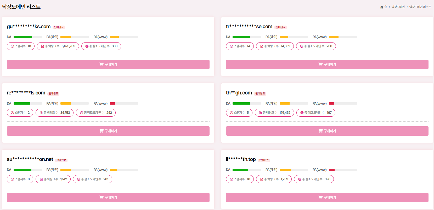 | 도메인 | DA | PA (메인, www) | 스팸 | 총 백링크 수 | 총 도메인 수 | 구매 |